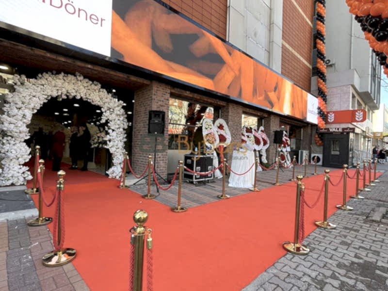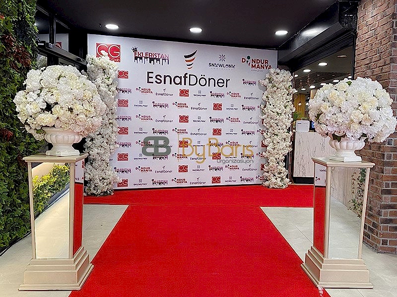 Kırmızı Halı ve Giriş Dekoru: Esnaf Döner Ümraniye Şubesi'nin açılışına özel olarak, konuklarımızı şıklıkla karşılamak için kırmızı halı serimi gerçekleştirdik. Halının etrafında özel süslemelerle, geleneksel ve şık bir atmosfer oluşturduk.
