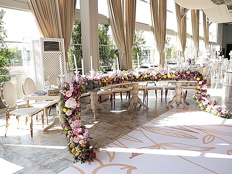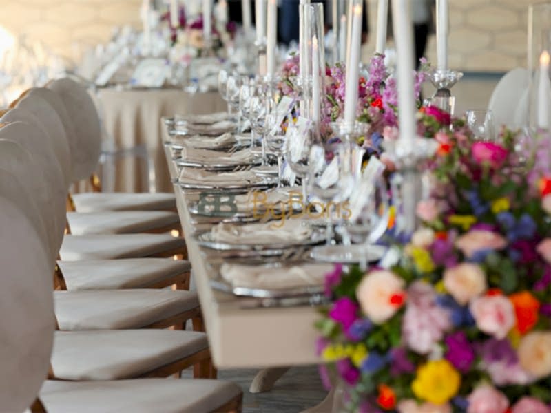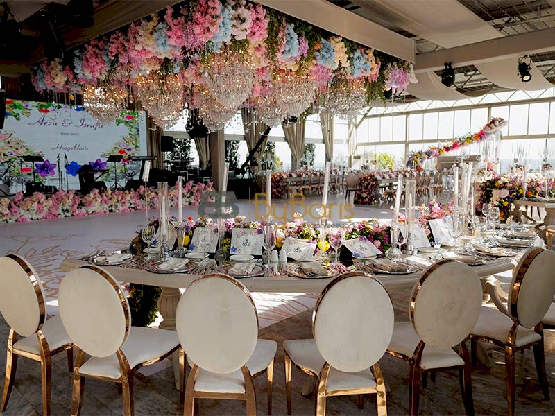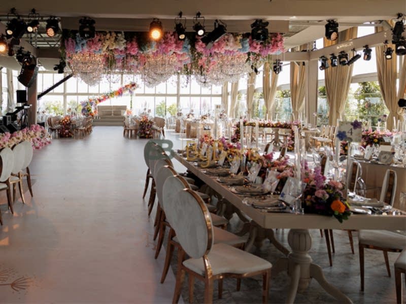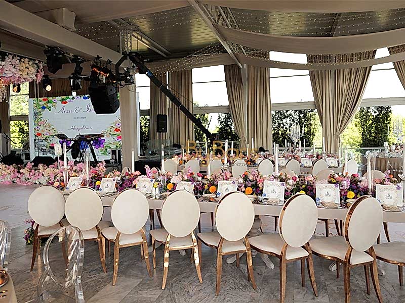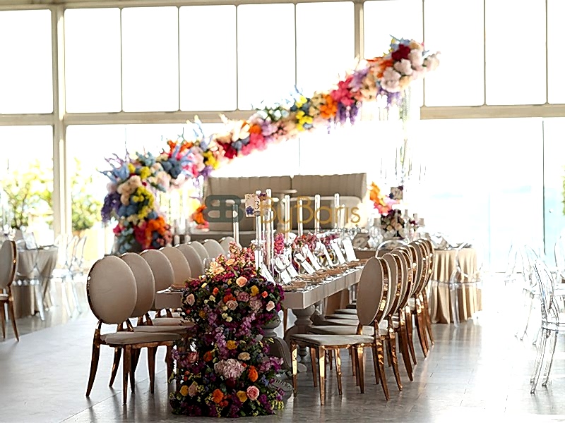 Masa ve sandalye dekorasyonu: Özel tasarım masa örtüleri, şık sandalyeler ve dekoratif detaylarla görkemli bir alan oluşturuldu.