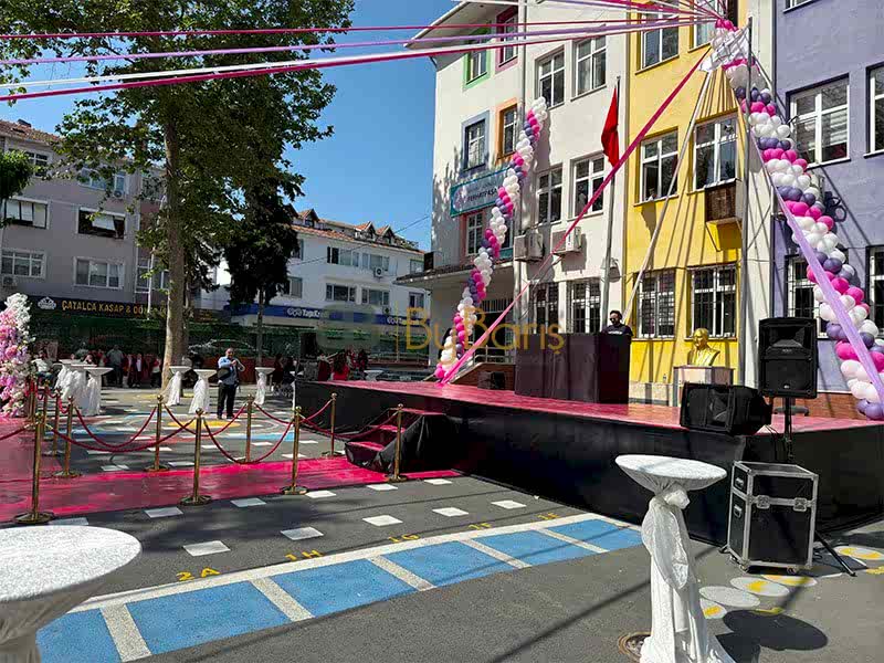 Balon Süsleme: Alan rengarenk balonlarla süslenerek neşeli bir atmosfer oluşturuldu.