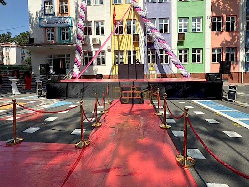 Sahne Kurulumu: Mezun öğrenciler için özel olarak tasarlanmış sağlam ve estetik bir sahne kuruldu.