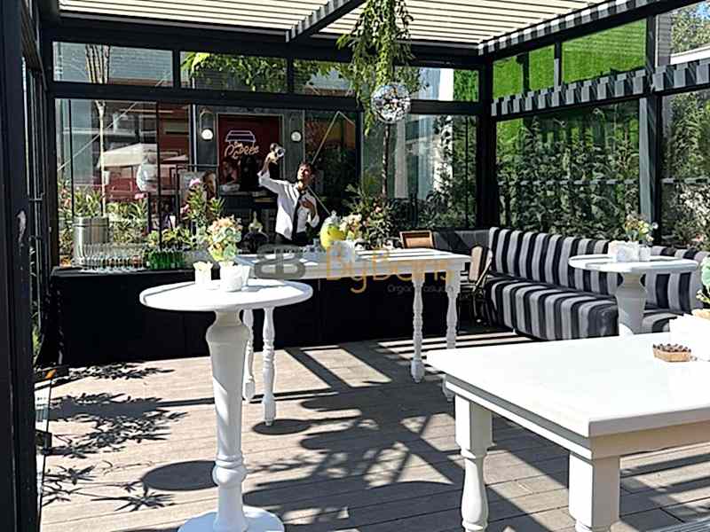 Etkinlik alanında düzenin sağlanması ve misafirlerin yönlendirilmesi için pirinç bariyerler kiraladık. Bu şık bariyerler, etkinlik alanını zarif bir şekilde şekillendirdi.Lake Bistro Masa Kiralama: