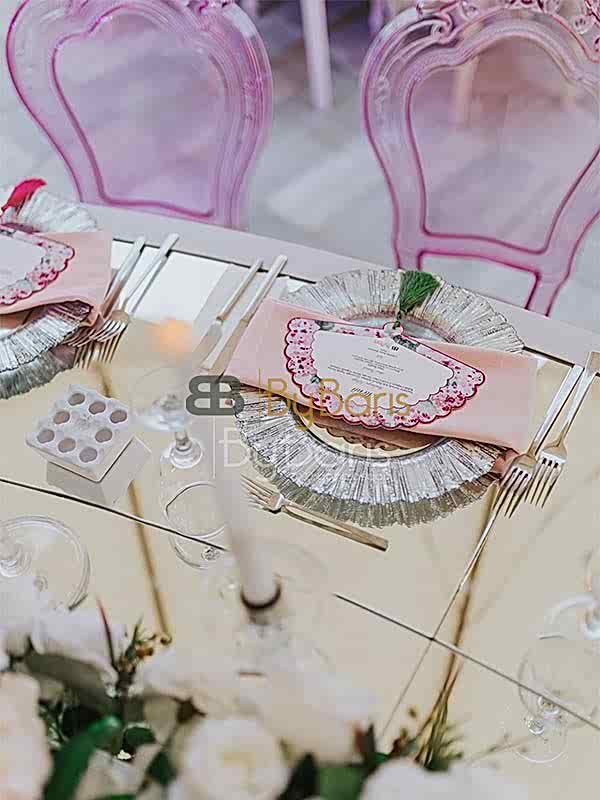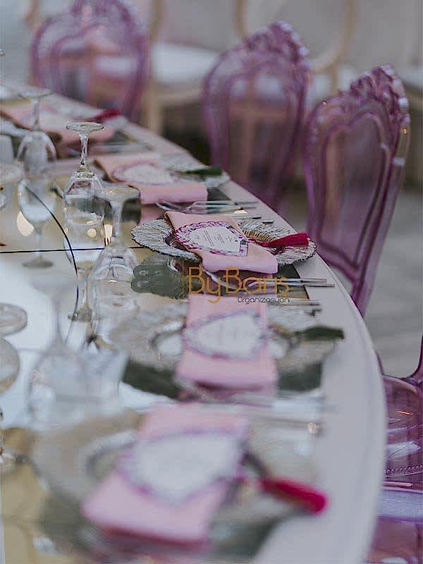 By Barış Organizasyon olarak catering hizmeti ile misafirlerin damak zevkine hitap eden özenle hazırlanmış menüler sunduk. Masalarda yer alan şık tasarımlı menü kartları ile düğün dekorasyonuna uyumlu ve estetik bir detay ekledik.