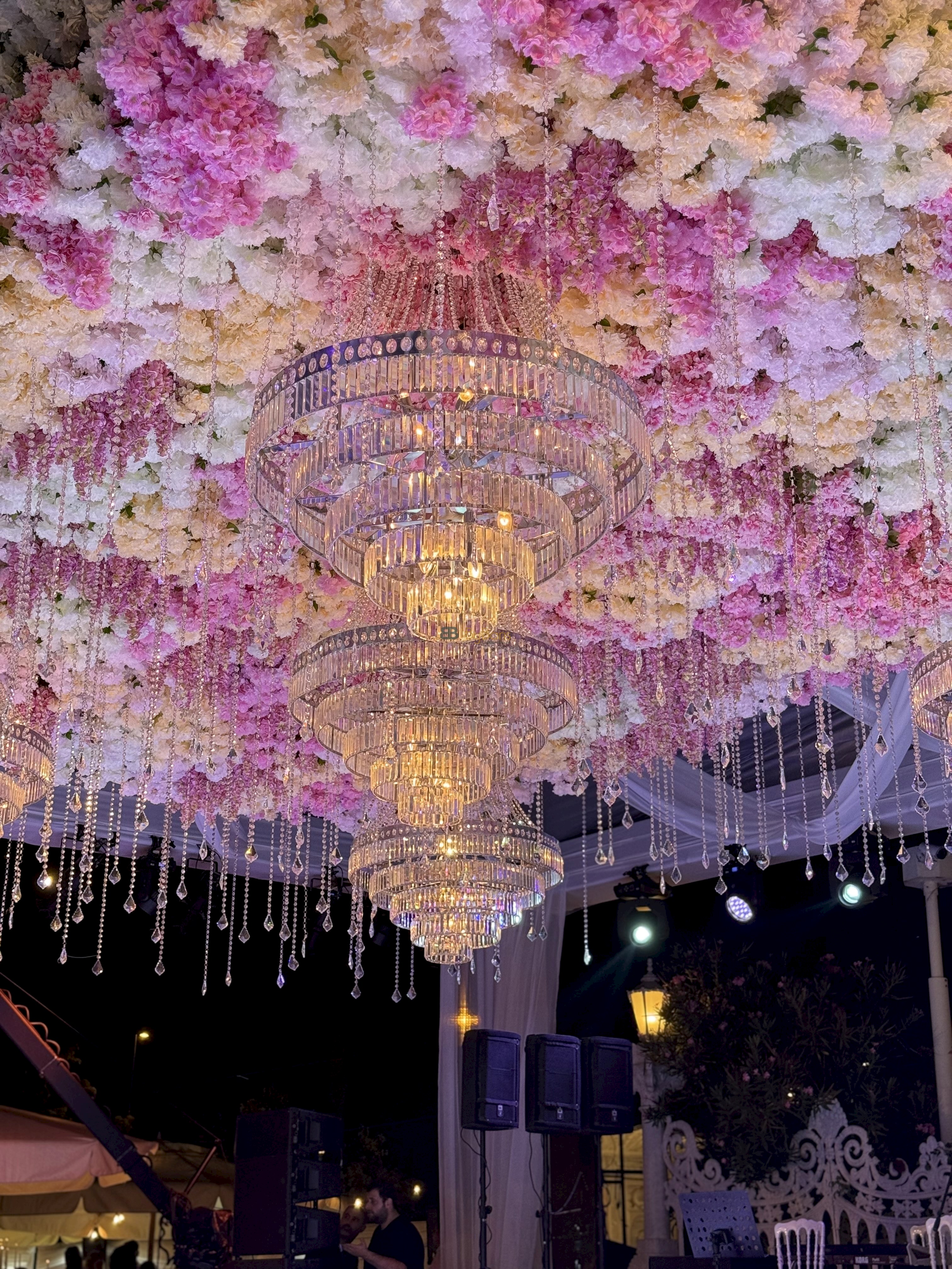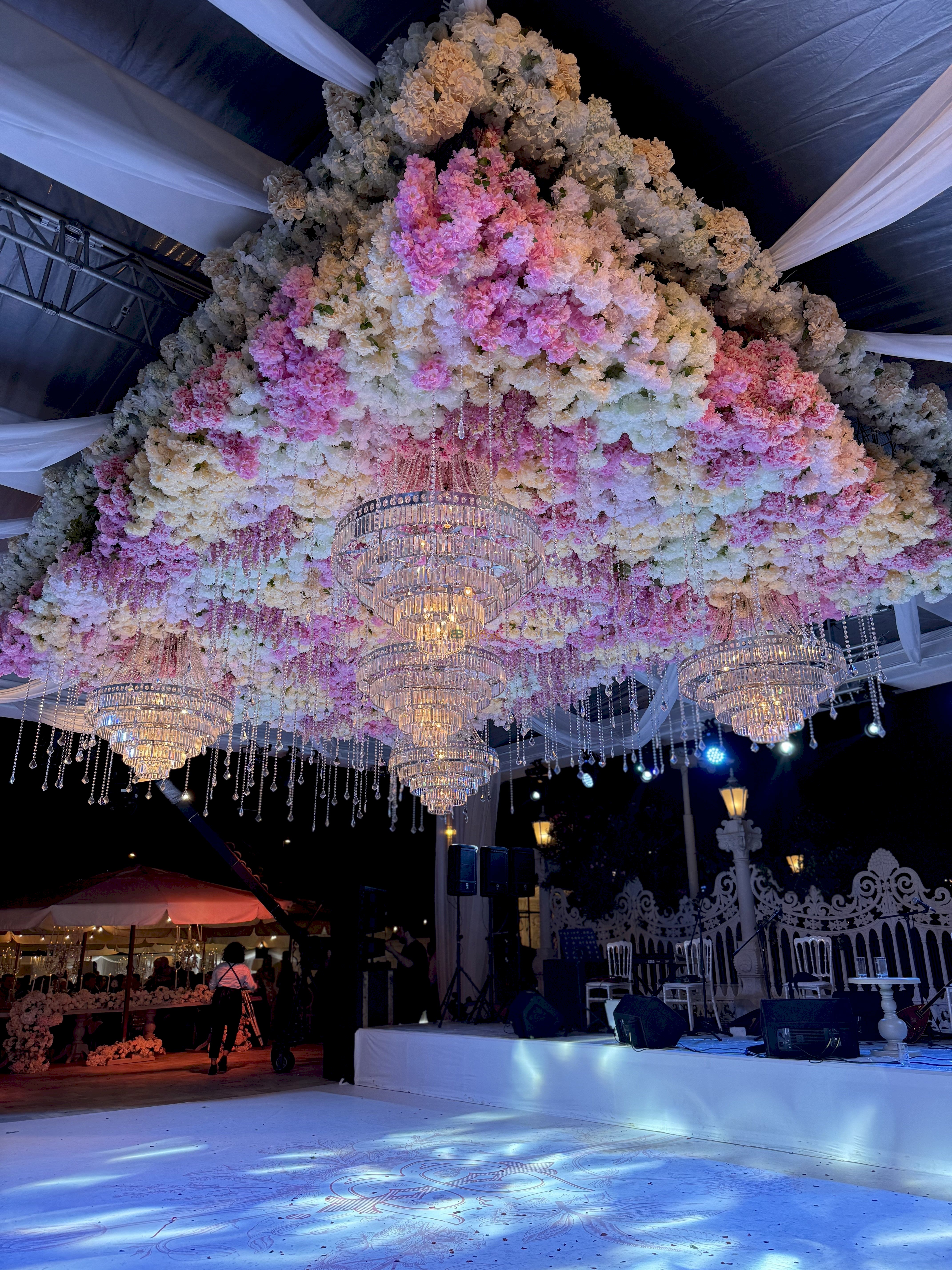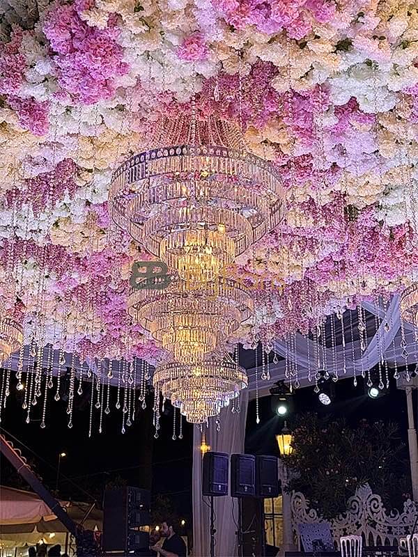 Mekânın genel atmosferini tamamlamak için tavan çiçekleri ve avize dekorları ile görkemli bir ambiyans oluşturduk. Bu dokunuşlar, düğün alanını zarif ve etkileyici hâle getirdi.