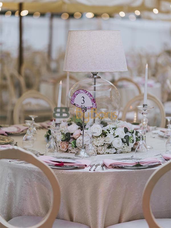 Masalara romantik ve zarif bir dokunuş eklemek için masa üstü süslemeleri ve canlı çiçek süslemeleri kullandık. Her detay, çiftimizin düğün konseptiyle uyumlu ve unutulmaz bir görsellik sunacak şekilde tasarlandı.