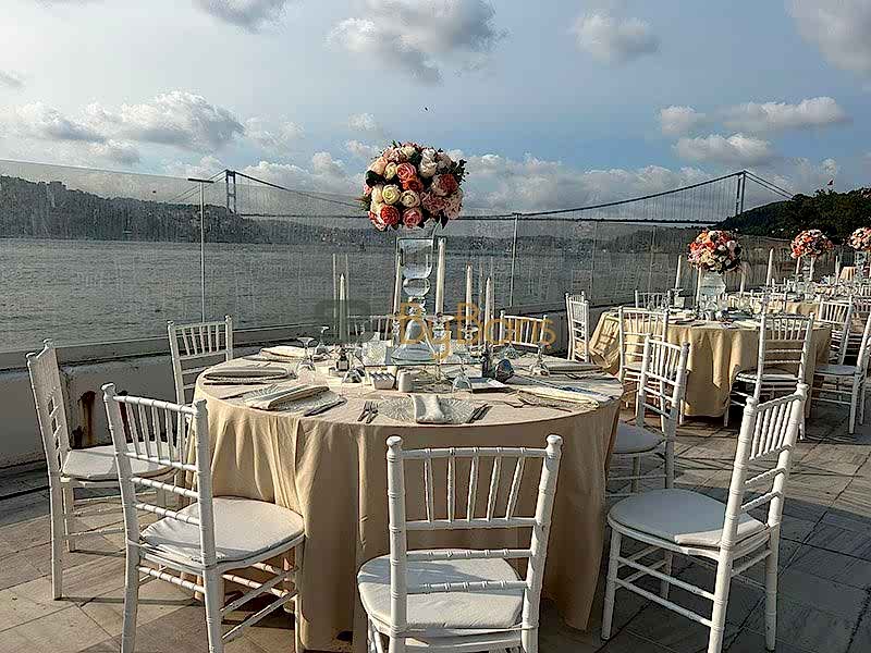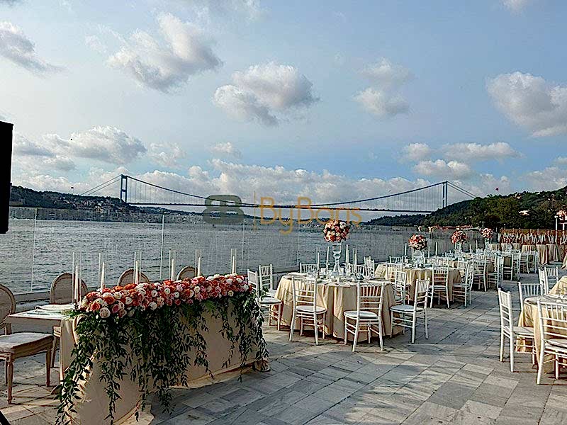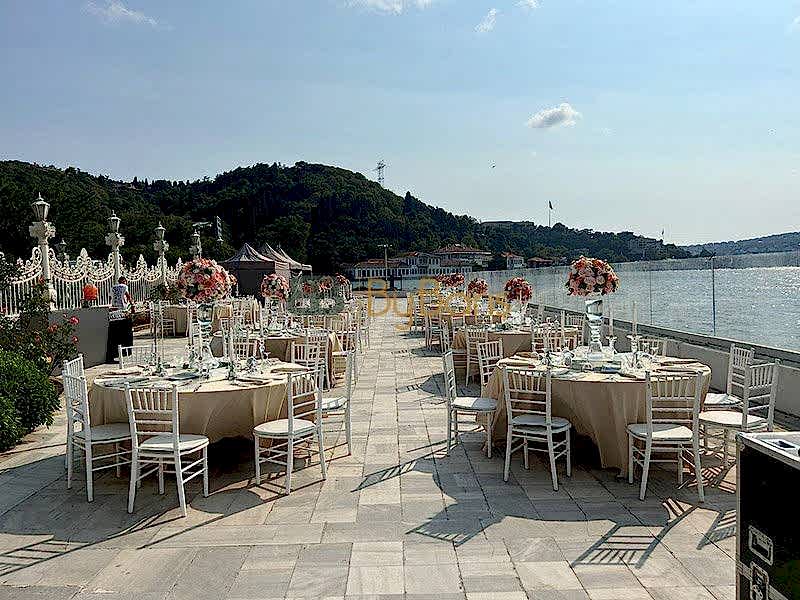 Mekan Dekorasyonu ve Tasarımı: Küçüksu Kasrı’nın tarihi ve zarif atmosferine uygun olarak, mekânın her köşesini dikkatle tasarladık. Çiftimizin istekleri doğrultusunda şık çiçek aranjmanları, zarif masa düzenlemeleri ve dekoratif detaylarla büyüleyici bir ambiyans yarattık.