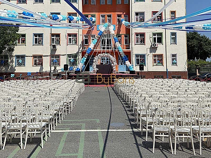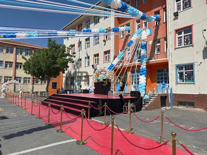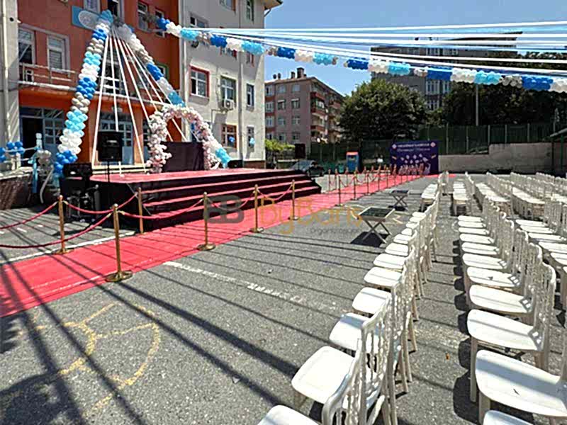 Kocasinan İlkokulu mezuniyet töreninde, yukarıdaki tüm unsurlar titizlikle planlandı ve uygulandı. Balon süslemesi, kırmızı halı kaplama ve podyum sahne kurulumu ile görsel bir bütünlük sağlanırken, animasyon gösterileri ve sihirbaz performansı ile etkinlik eğlenceli bir hale getirildi. Misafirler, lake bistro masa ve sandalye kiralama ile rahat bir oturma deneyimi yaşadı. Güvenlik ve düzen için kullanılan pirinç bariyerler ve profesyonel ses sistemi etkinliğin kusursuz ilerlemesini sağladı. Ayrıca özel fotoğraf çekim alanı, bu özel anların ölümsüzleşmesini sağladı.